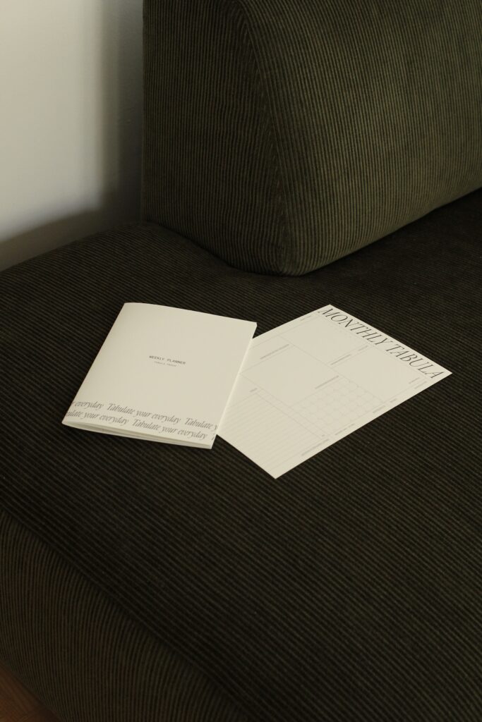 Nämä ylemmän tason teemat viedään astetta konkreettisemmiksi Monthly Tabula -kuukausinäkymään. Kuukausinäkymään merkitään tärkeiden päivämäärien lisäksi muun muassa asiat, joihin haluaa sen kuukauden aikana keskittyä. Sen lisäksi, että kuukausinäkymässä mietitään oman hyvinvoinnin pilareita, otetaan huomioon myös ympärillä oleva yhteisö – miten voisi luoda hyvää muille, oli se sitten hyväntekeväisyystyötä tai yhteistä aikaa ystävien kanssa.