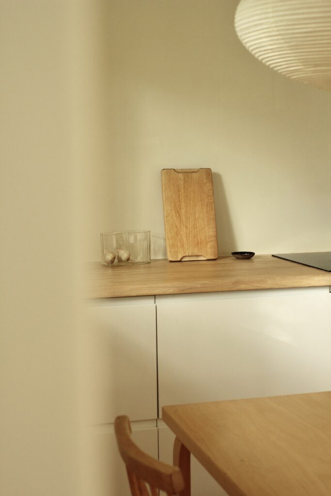 Olohuoneen, keittiön ja eteisen seinille valitsimme lämpimään taittavan valkoisen Cream White -sävyn. Sävy tuntui erityisen sopivalta, sillä se yhdistyy kauniisti puupintojen ja tammiparketin kanssa, eikä riitele seinillä olevien taulujen kanssa vaan tuo ne esille kauniisti.